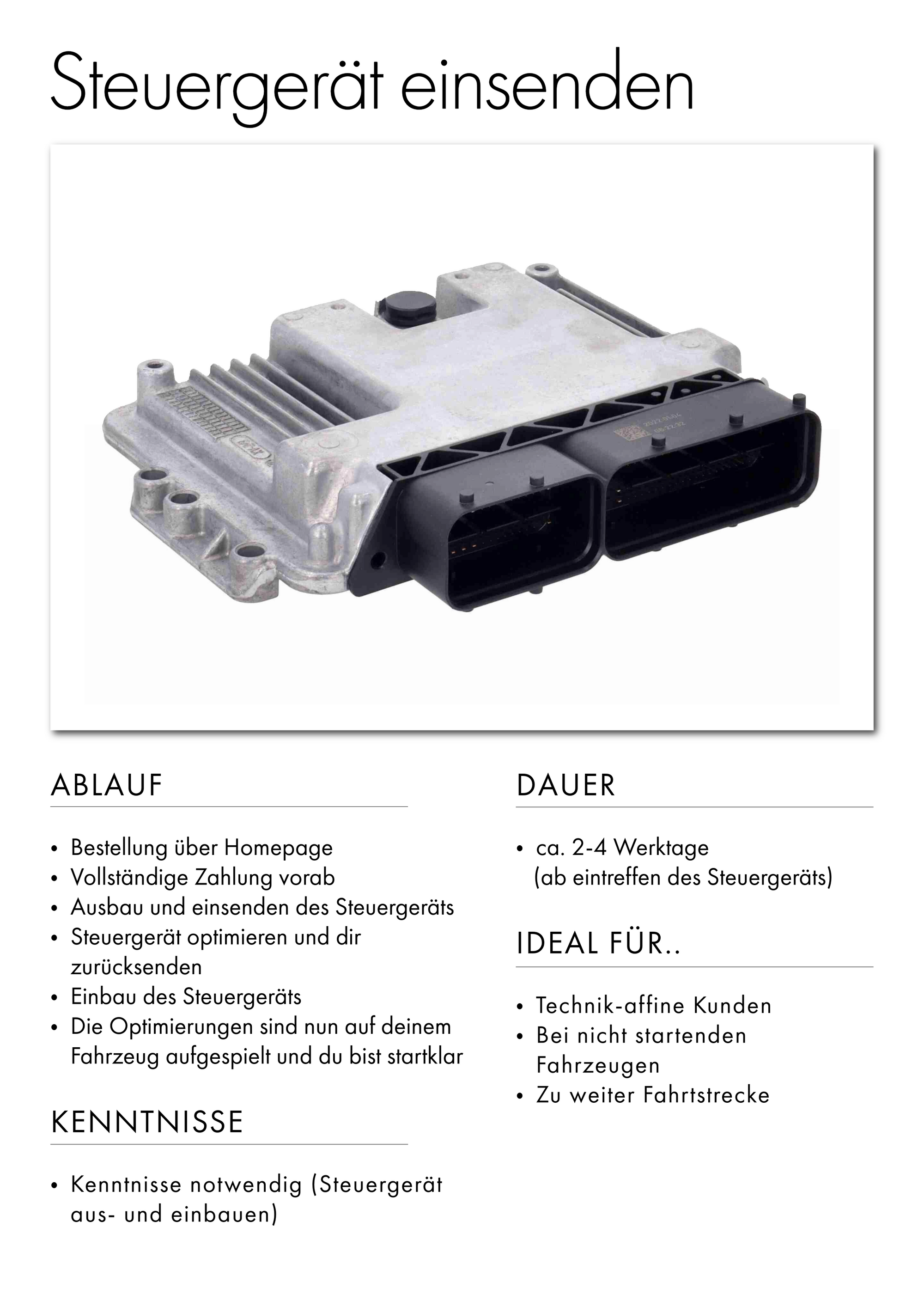 Für alle, die den Ein- und Ausbau ihres Steuergeräts selbst erledigen können, ist der Versandweg eine bequeme und kostengünstige Option. Du schickst uns dein Steuergerät zu, wir spielen die gewünschte Optimierung auf und senden es dir umgehend zurück – einsatzbereit und leistungsoptimiert.