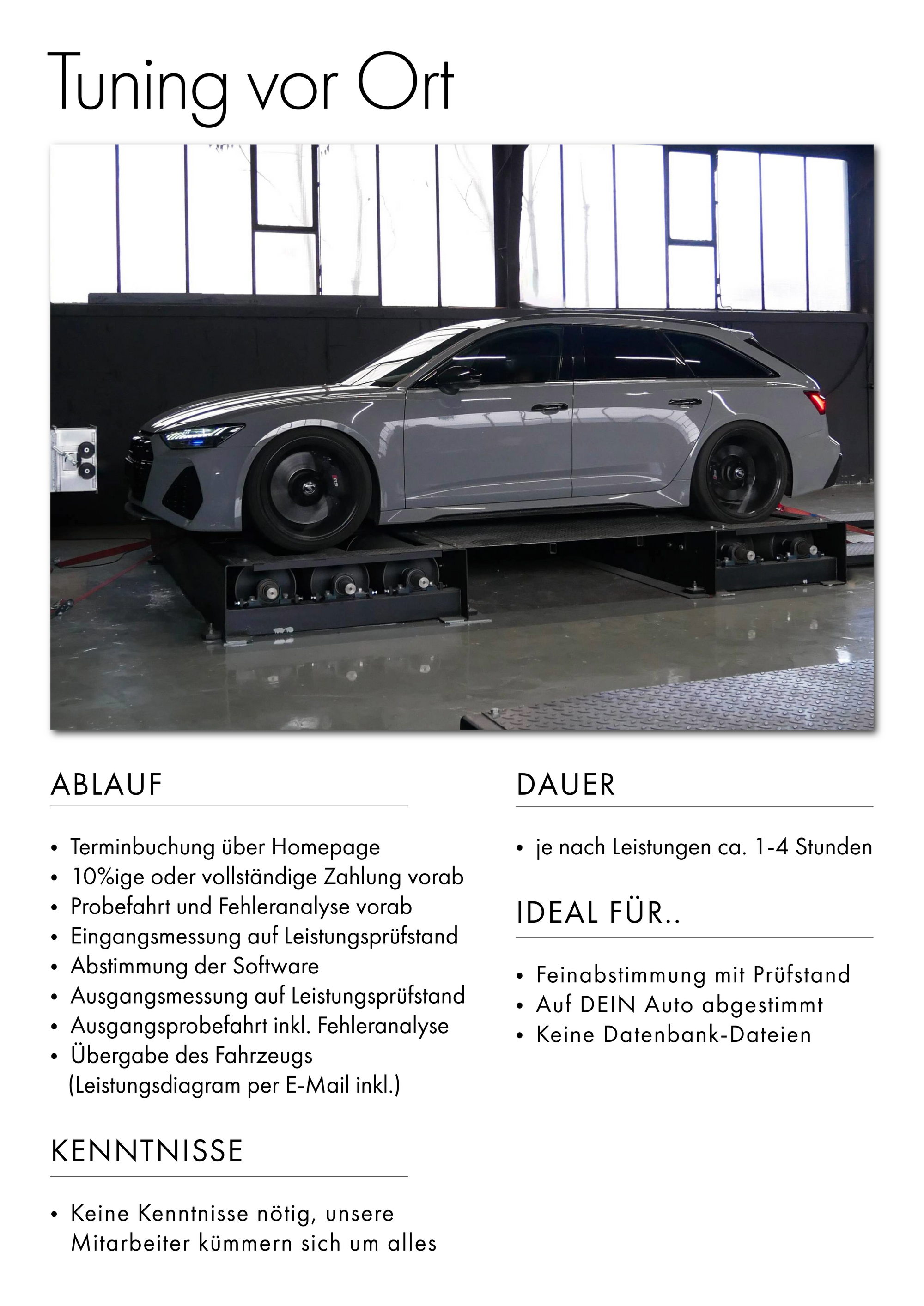 Du möchtest dein Fahrzeug in professionelle Hände geben? Dann bist du bei uns vor Ort genau richtig. Wir lesen dein Steuergerät direkt aus, analysieren die Software und spielen die passende Optimierung auf – ganz ohne Wartezeit oder Versandstress. Einfach Termin vereinbaren, vorbeikommen und das Ergebnis direkt erleben.